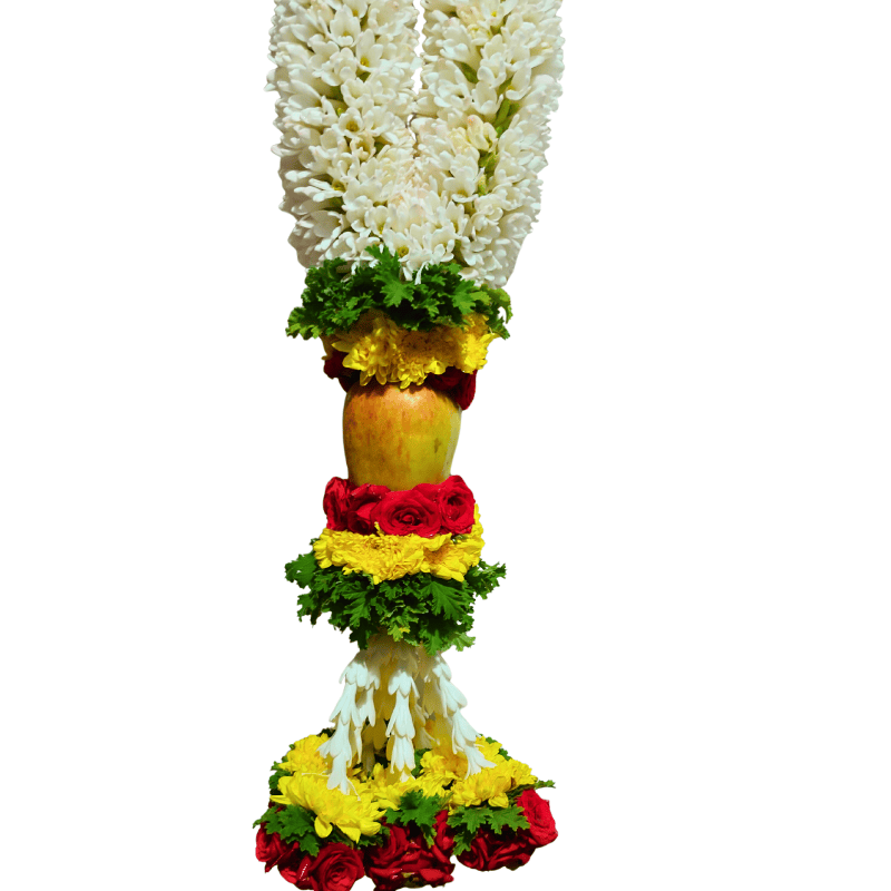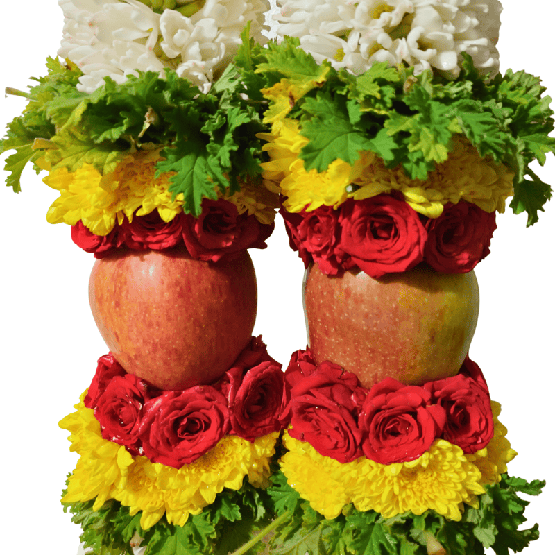 The Divine Tuberose Apple Garland – 6 ft is a sacred, handcrafted wedding garland made with fresh tuberose, red mirable roses, yellow chrysanthemums, fragrant paneer leaves, and two auspicious apples—symbolizing purity, prosperity, and divine blessings.