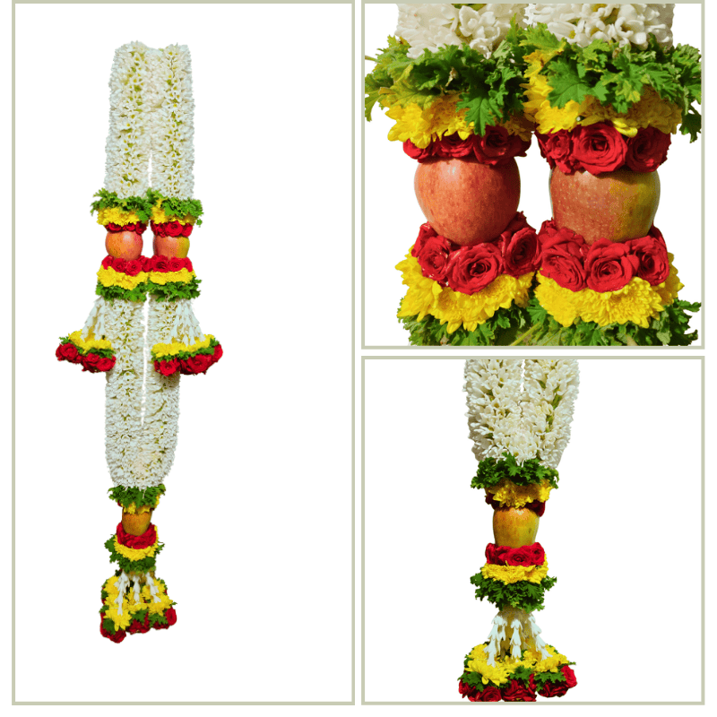 At the heart of the design, two fresh apples are artistically placed and encircled with red mirable roses, golden-yellow chrysanthemums, and lush paneer leaves, creating a rich visual contrast and deep symbolic meaning. Apples signify prosperity and fertility, while tuberose reflects purity and devotion—making this garland ideal for bridal wear, deity adornment, and muhurtham rituals.