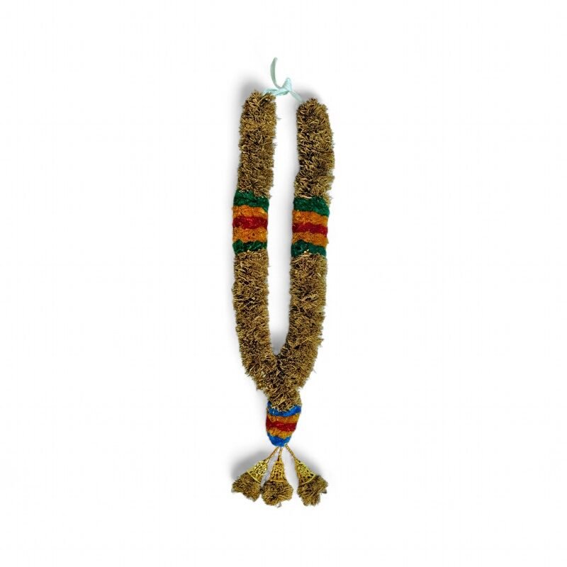 The use of Vetiver in this garland speaks volumes. Known for its grounding properties, vetiver has long been a symbol of tranquility and protection. Its essence is believed to invite peace and calm, making it ideal for spiritual gatherings. The intricate green and red borders add a festive touch, signifying prosperity and joy, completing this garland as a perfect representation of harmony and celebration.